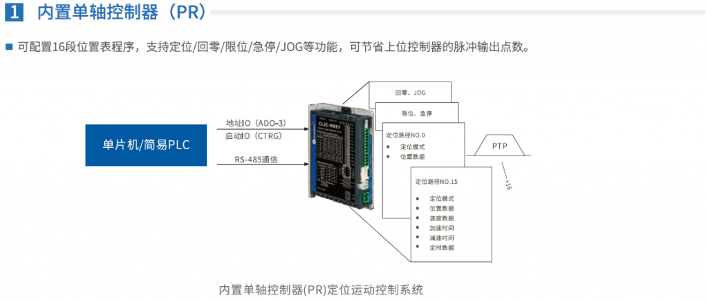 - 可配置16段运动路径, 支持回零/限位/急停/定位/JOG等功能