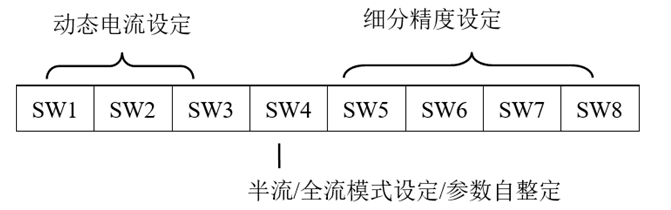 DM882S驱动器采用八位拨码开关设定细分精度、动态电流、静止半流以及实现电机参数和内部调节参数的自整定。详细描述如下: